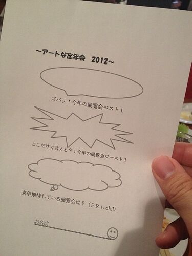 火曜日、お仕事。定時後に組合の会合…うむむむ…会社を出て、神田で楽しい忘年会。こんなお題が出たりしてました 京浜東北線で寝過ごして根岸まで行ってしまいましたが、大船まで行かなくてよかった… 在華坊(@zaikabou)/2012年12月18日 - Twilog