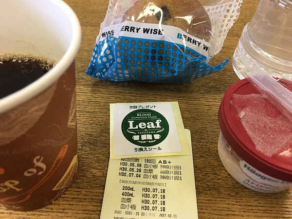 192回目、横浜Leaf献血ルームで血小板20単位。今日の人は注射上手だった。