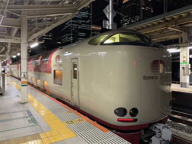 東京駅を出発、すぐにお弁当を食べる。いつもの見慣れた光景、会社帰りの人も大勢見えるホームが過ぎゆくのを見ながら、こちらは夜行列車。この非日常感がたまらない。やっぱりサンライズは東京から乗りたいよね
